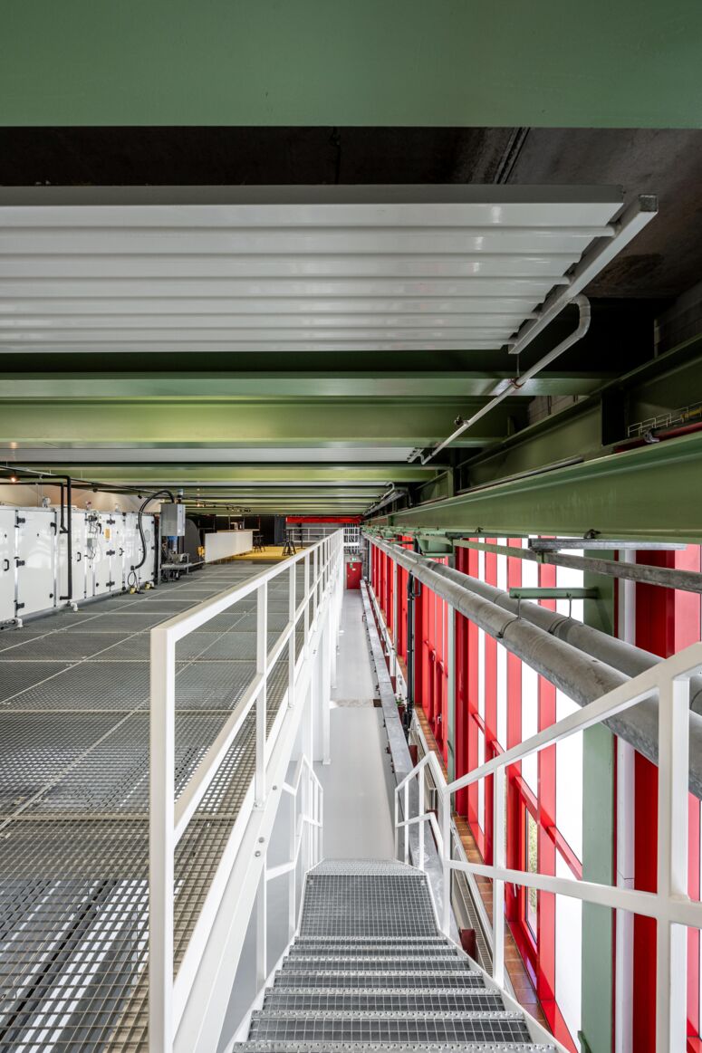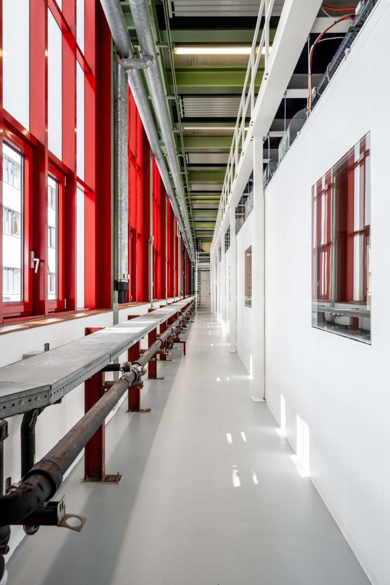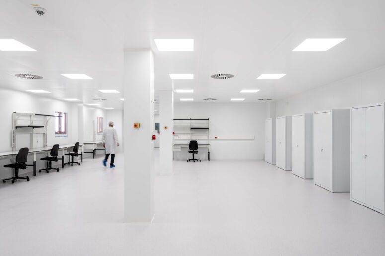 Der Reinraum ist einerseits räumlich perfekt in die Halle integriert, kein Quadratmeter wurde verschenkt, alles ist am richtigen Platz. Andererseits zeichnet er sich als weiße "High-Tech-Maschine" von der kathedralenartigen Industriehalle mit ihren hohen feuerroten Fenstern, schilfgrünen Stahlträgern und grauen Betonoberflächen ab.