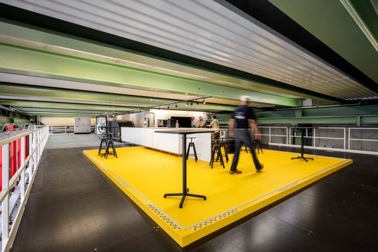 Als besonderes Highlight haben wir auf der "Dachterrasse" des Reinraums auch die Teeküche für die Mitarbeiter und Gäste angeordnet. Damit keine Flüssigkeit auslaufen kann und es zu Schäden an der Technik oder den empfindlichen Satelliten kommt, sitzt die Küche samt der Bestuhlung in einer wasserdichten gelben Wanne.