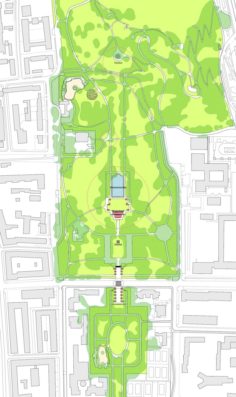 Wir haben uns daher mit seiner Geschichte auseinandergesetzt und dabei entdeckt, dass ursprünglich geplante Bauteile zwar angelegt sind, aber noch nicht realisiert wurden: Ein großes Wasserbecken und ein opulenter Brunnen, nördlich des Linden-Hains mit dem Obelisken.