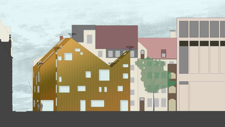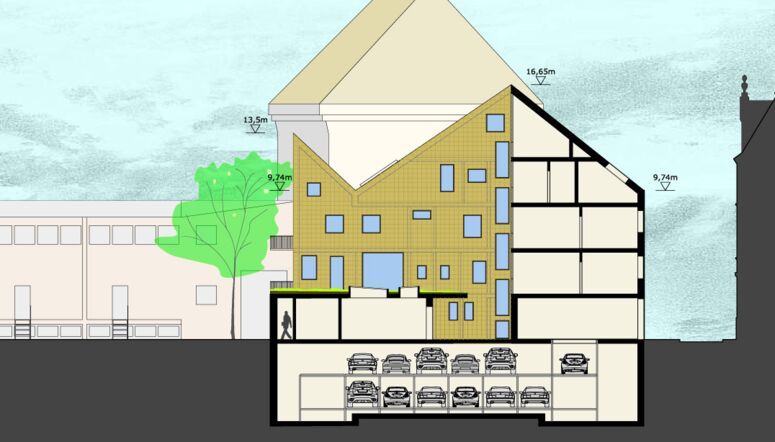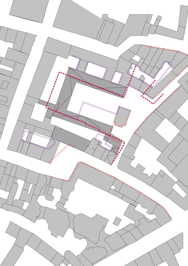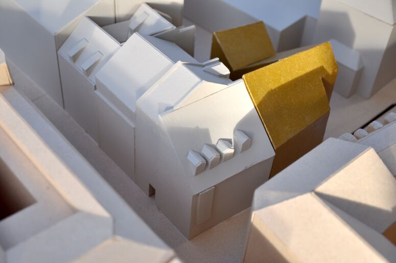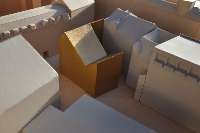 Unser Entwurf greift historische Baulinien wieder auf, interpretiert sie neu und bietet sich als ersten Baustein an, um das Innere des großen Gevierts in einen lebenswerten, zugleich modernen wie geschichtsbewussten Ort zu verwandeln. Der neue L-förmige Baukörper, aufgrund der Dachform und der geplanten Materialisierung von uns „Krone“ getauft, bildet den Rücken für mittelalterliche Stadtfragmente am Rande des Grundstücks. Altstädtische Innenhöfe entstehen. Straßenseitig schließt er an die ehemalige Gaststätte „Zur Hundskugel“ direkt an, eine alte Gasse wird an dieser Stelle wieder spürbar.