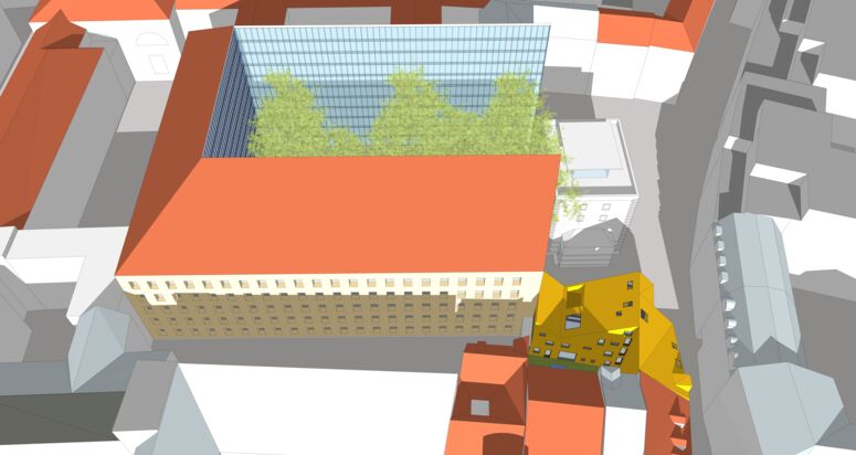 Erstaunlicherweise ist die Münchner Altstadt noch immer nicht zu Ende gebaut: In der Mitte der Stadt, im historischen Hackenviertel, unweit der Fußgängerzone, befindet sich bis heute eine städtebaulich vollkommen ungeklärte Situation. Fensterlose Infrastrukturgebäude der Stadtwerke, eine Industriehalle, ein Hochbunker, eine Garagenzeile und Asphaltflächen prägen den weit aufgerissenen Ort.