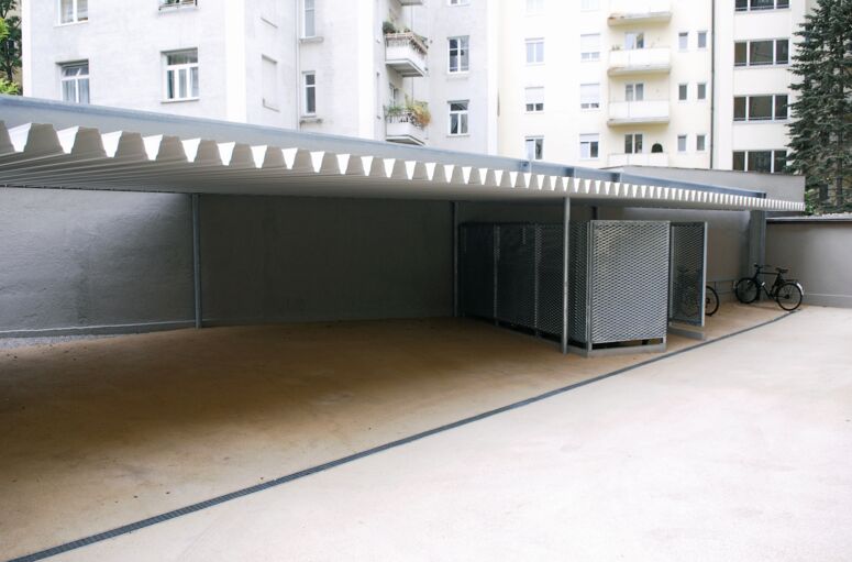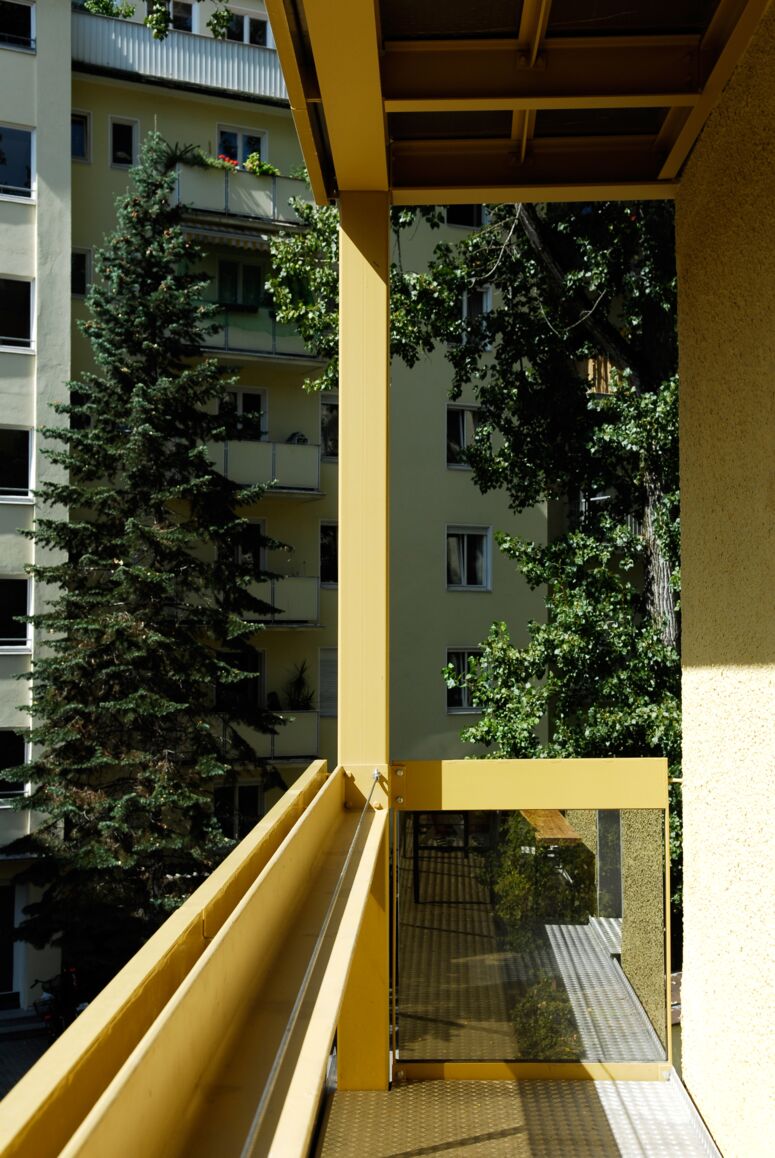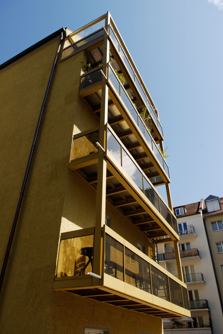 Der Bauherr hatte anfangs eine Rekonstruktion der Jugendstilfassade im Sinn. Für ihn viel günstiger, konnten wir ihn von den Qualitäten des Bestandes überzeugen. Wir entwickelten Maßnahmen, die das düstere Gebäude in einem neuen Licht erscheinen ließen: Die Fenster der Straßenfassade wurden vereinheitlicht, indem wir überall dem Bestand exakt nachgebaute Sprossen-Kastenfenster einsetzen, auch dort, wo sie in der Zwischenzeit verloren gegangen waren. Die maroden Balkone und die rostige Feuerleiter im Hof wurden abgebrochen, stattdessen eine maßgeschneiderte Balkonanlage mit integrierter Feuerleiter errichtet. Auch das baufällige, geschlossene Garagengebäude im Innenhof konnte durch einen offenen, weit spannenden Carport ersetzt werden, mit Platz für drei Autos, zehn Fahrräder und einem Müllhaus aus Streckmetall (mit Mies-Ecken).