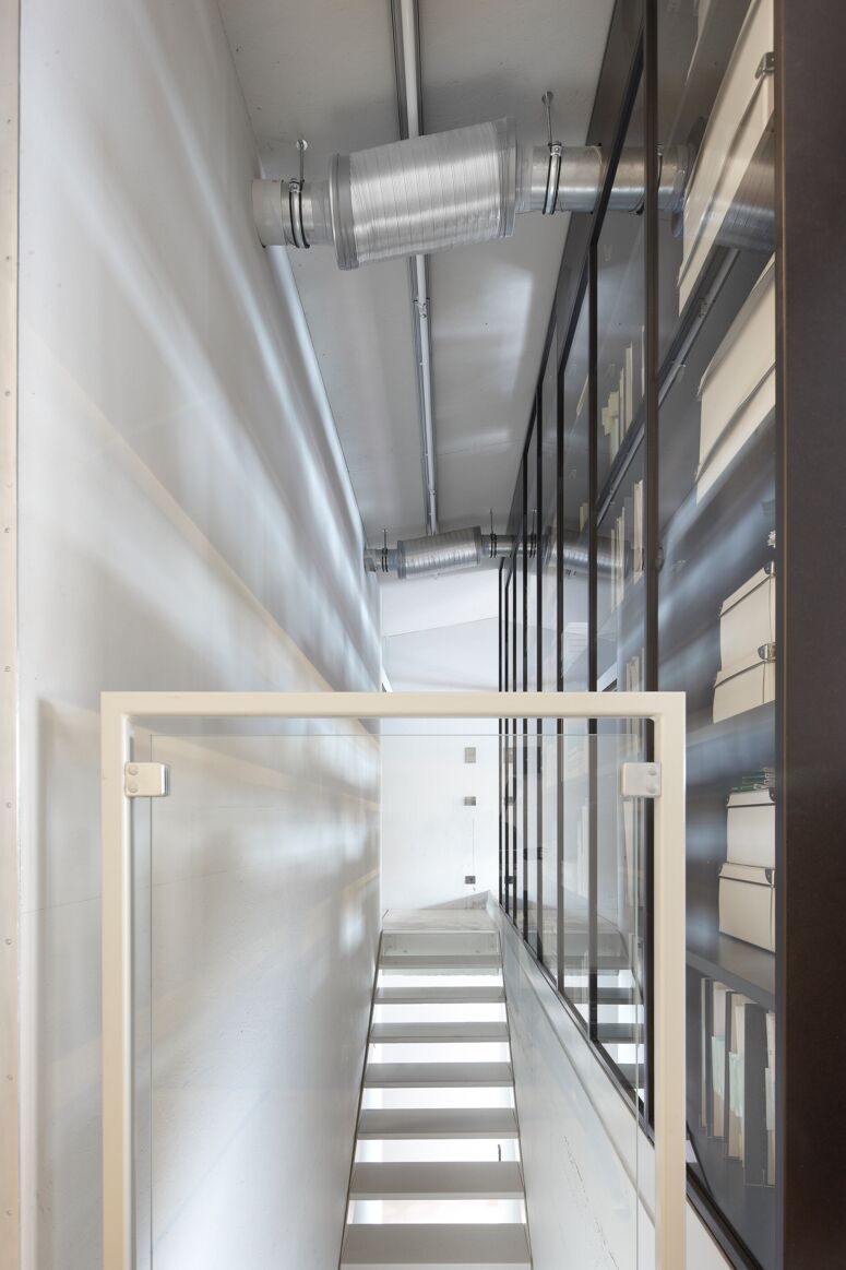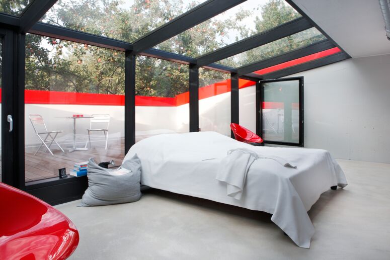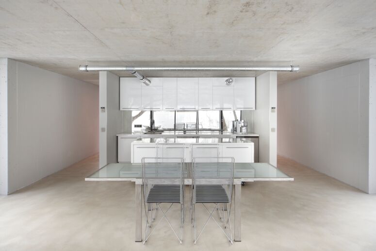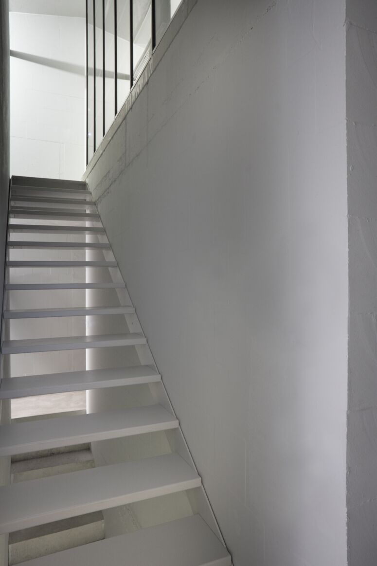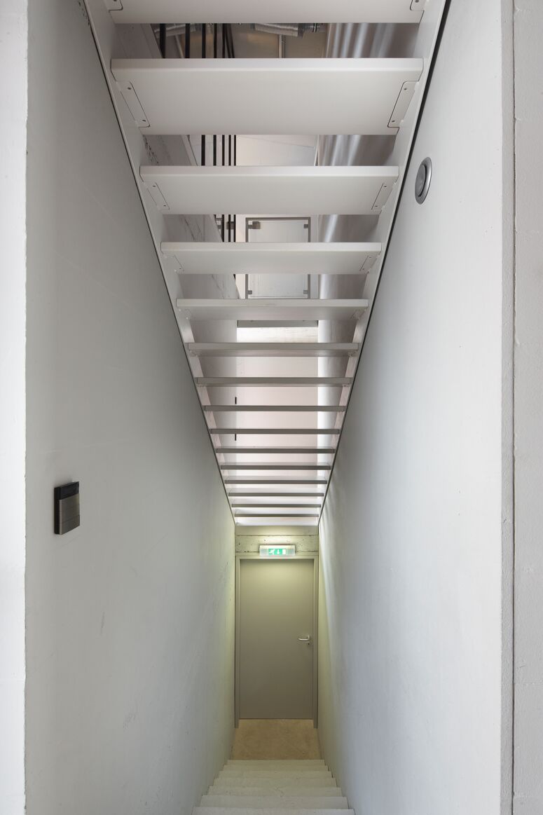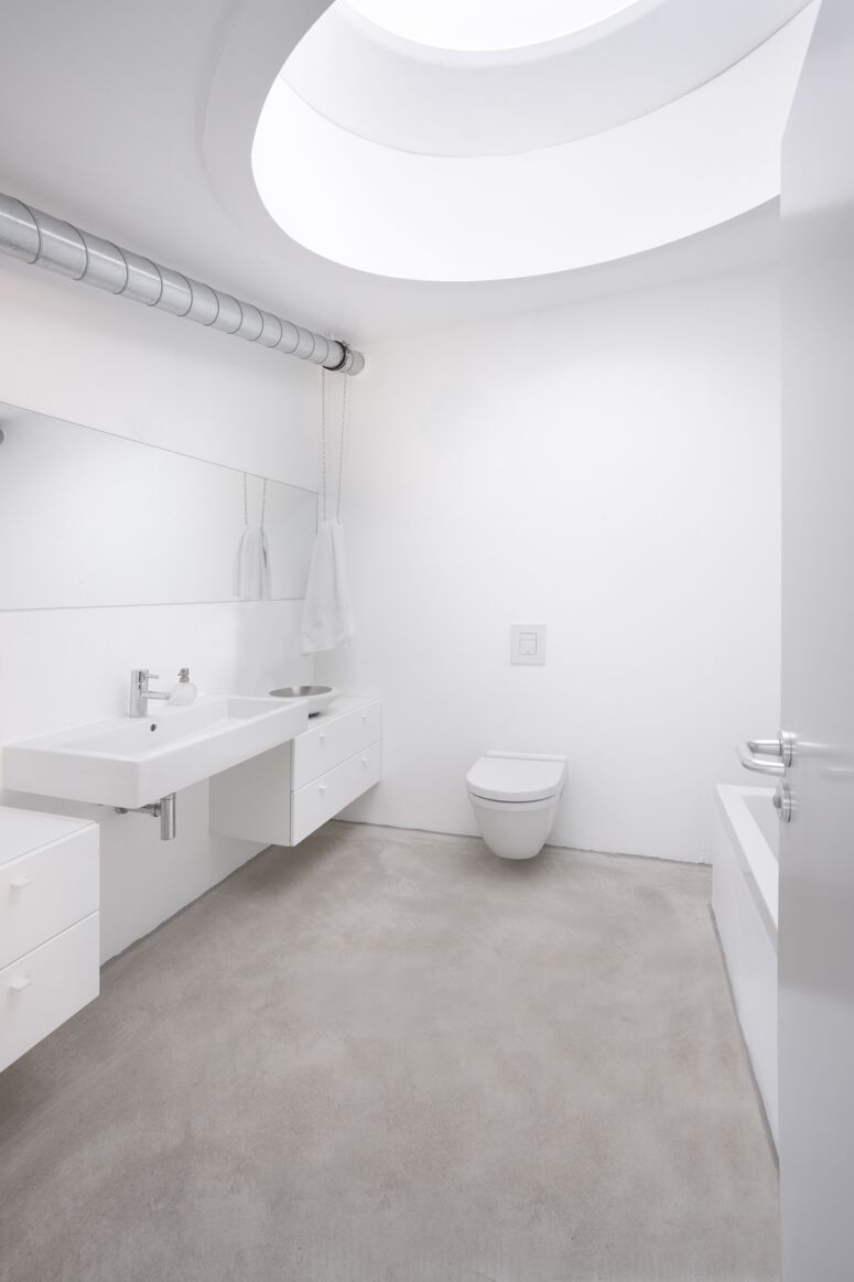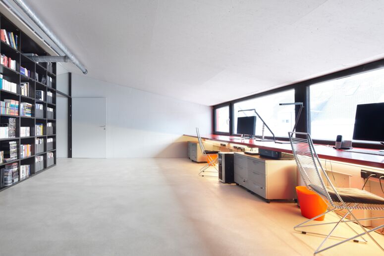 Die Bauherrin liebte Design, der Bauherr Technik, beide liebten Autos. Für die Form von Haus V inspirierte uns der James-Bond-Sportwagen Lotus Esprit. Fassaden, Tragwerk, Raumgefüge und die Trassierung der technischen Gebäudeausstattung entsprechen einander und bilden in der T-Form des Gebäudes eine systematische Einheit. Durch diese klare, sich innen und außen entsprechende Form entsteht strukturell eine hohe Effizienz und echte Einfachheit.