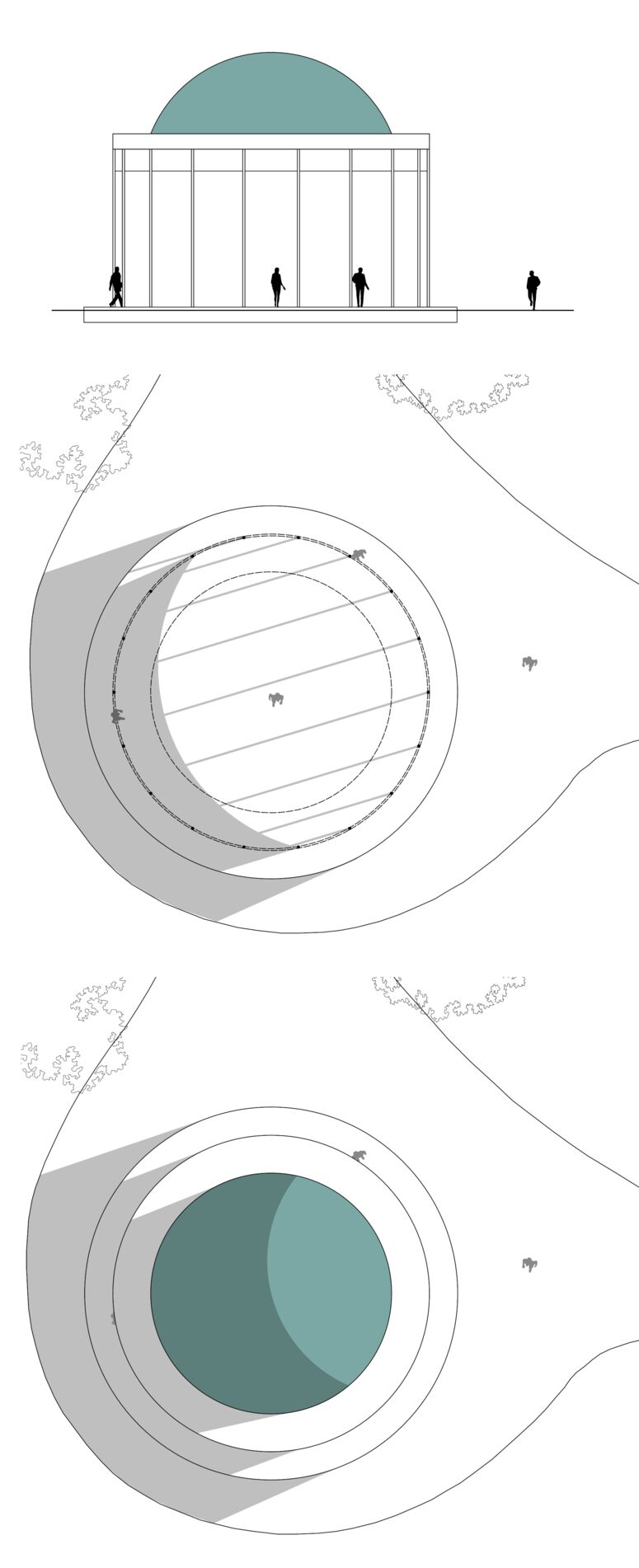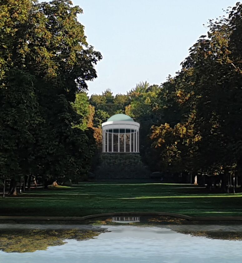 Als Gegenüber des Obelisken, als Endpunkt der Blickachse des langen Parterre, schlagen wir zum anderen einen runden Pavillon als weißen leichten Stahlbau mit zarten Stützen vor, auf einer Anhöhe des Schuttberges gelegen. Derartige Pavillions gibt es in vielen Stadtparks der Welt, hier finden Musikdarbietungen statt, es kann getanzt, diskutiert und gelesen werden - oder man genießt einfach nur die Stille, die Umgebung und den schönen Blick.