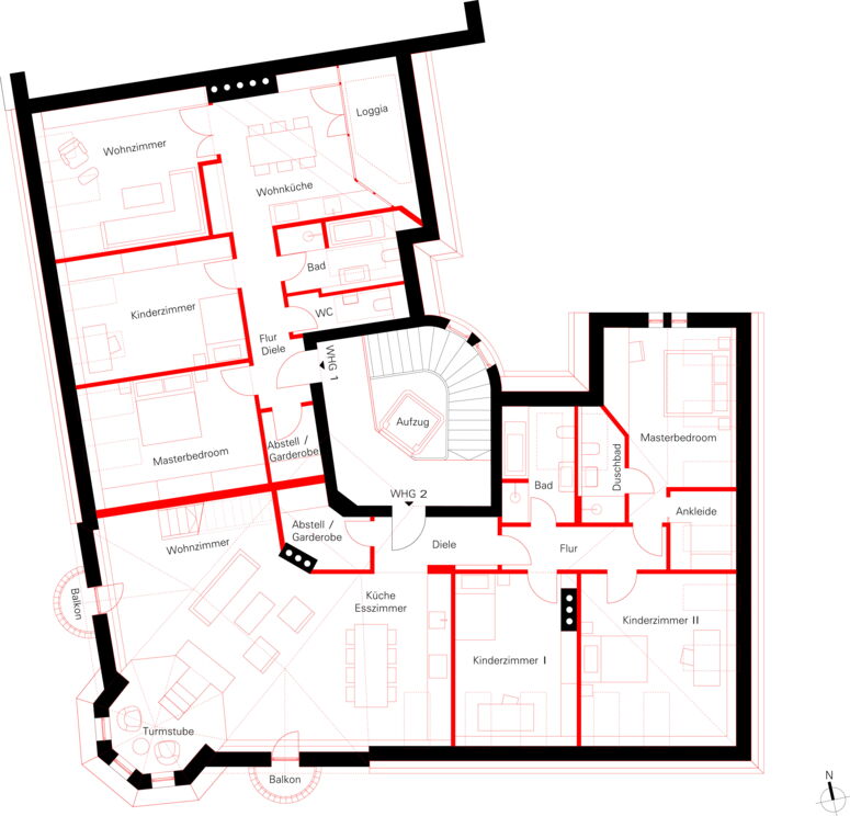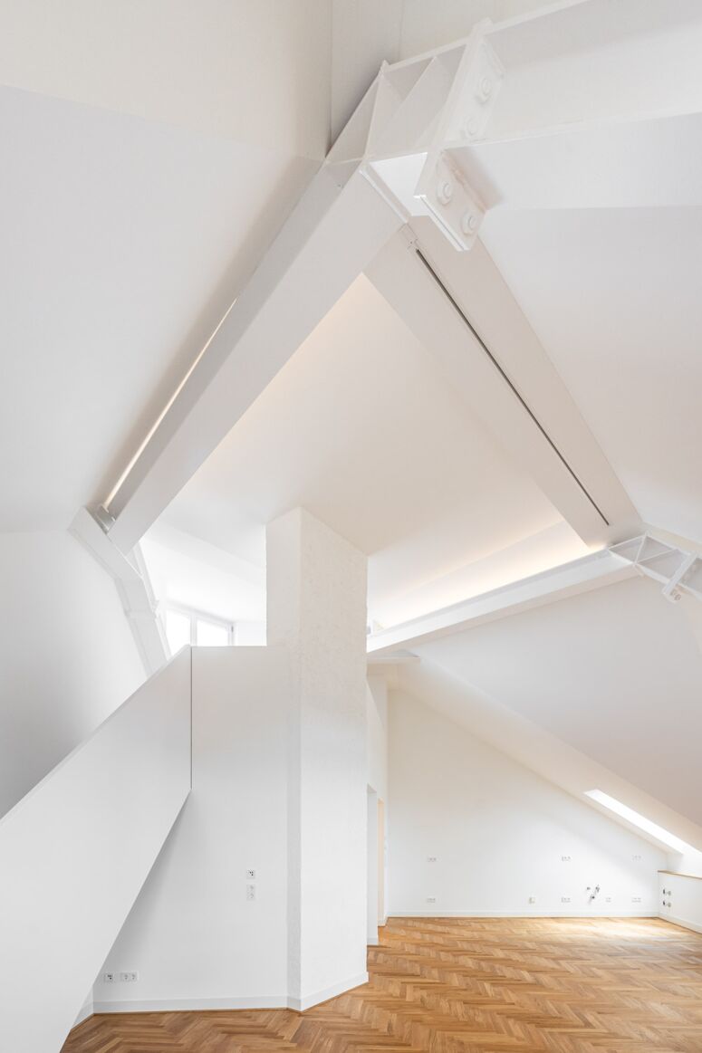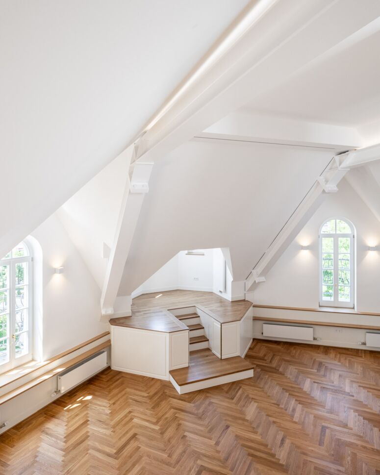 Die beiden im Dach neu entstandenen Wohnungen sind sehr weitläufig und hell. Die größere der beiden verfügt über eine zweigeschossige Wohnhalle, mit Kamin, Galerie, Dachterrasse, Turmstube und einer atemberaubenden Aussicht über das Häusermeer der Stadt bis zur Frauenkirche bzw. über die Theresienwiese bis zu den Bergen.
