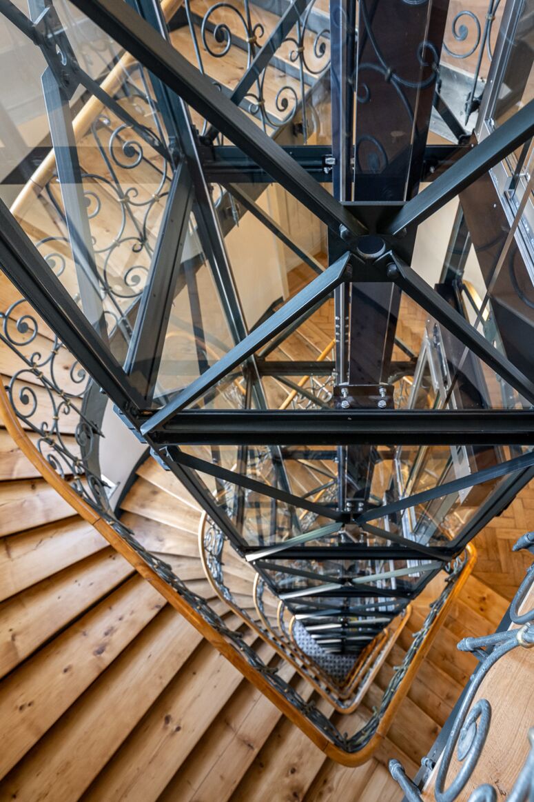 Auch die beiden Ziergiebel, die Stuckgesimse und die Jalousiebleche über den Fenstern, wurden an den Prunkfassaden anhand historischer Pläne und Fotos rekonstruiert. Viele Fenster und die Eingangstüren wurden denkmalgerecht neu geplant und ausgetauscht. Für die Gastronomie im Erdgeschoss wurde ein neuer Kellerzugang über eine beheizte Freitreppe aus Beton in der engen Durchfahrt angebaut. Und im Auge des großen Treppenhauses wurde ein hydraulischer Aufzug freistehend aufgebaut, der an die genietete Stahlkonstruktion der zeitgleich zum Haus entstandenen Hackerbrücke erinnert.