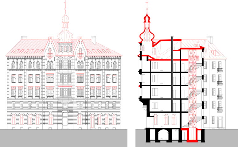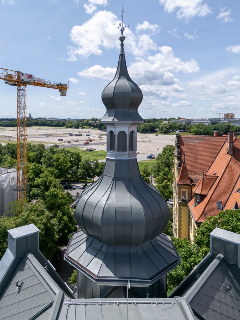 Nach einer intensiven Planungsphase mit zehn divergenten Instanzen, wurde schließlich entschieden, den originalen Dachstuhl aus Holz komplett abzubrechen, um das Dach anschließend neu zu errichten, einschließlich der Rekonstruktion des ursprünglichen Eckturmhelms als Doppelzwiebel. Da das Haus bis unters Dach durchgängig vermietet ist, war es eine große organisatorische und technische Herausforderung, das Tragwerk des mehr als zehn Meter hohen Turmhelms so zu ertüchtigen, dass der Helm von nun an den Windkräften an dieser Stelle standhält.