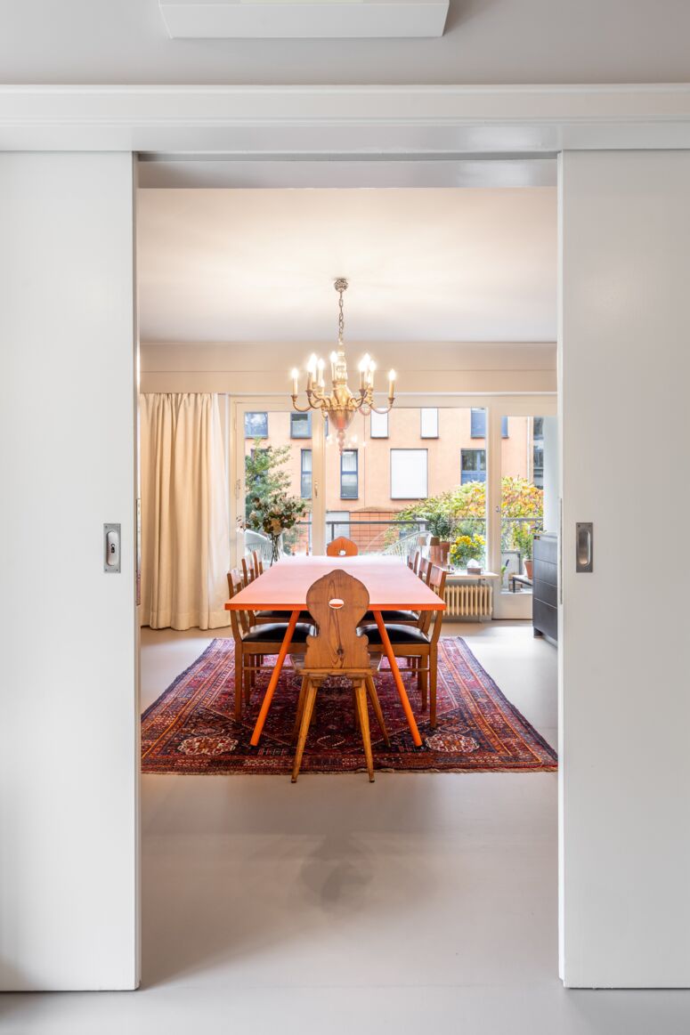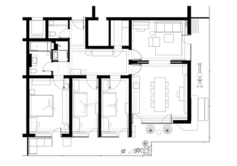 Unsere Idee war, die Wohnung nur mit eher kleinen Veränderungen, mit Verbesserungen, in „die beste Version ihrer selbst“ zu verwandeln. Wir verlegten die Küche ins große Wohnzimmer, um einerseits ein drittes Schlafzimmer zu erzeugen und um andererseits Essen und Kochen in den Mittelpunkt der Wohnung zu rücken. Das kleinere Esszimmer mit Blick ins Grüne wurde zum gemütlichen Wohn- und Musikzimmer.