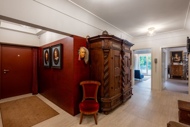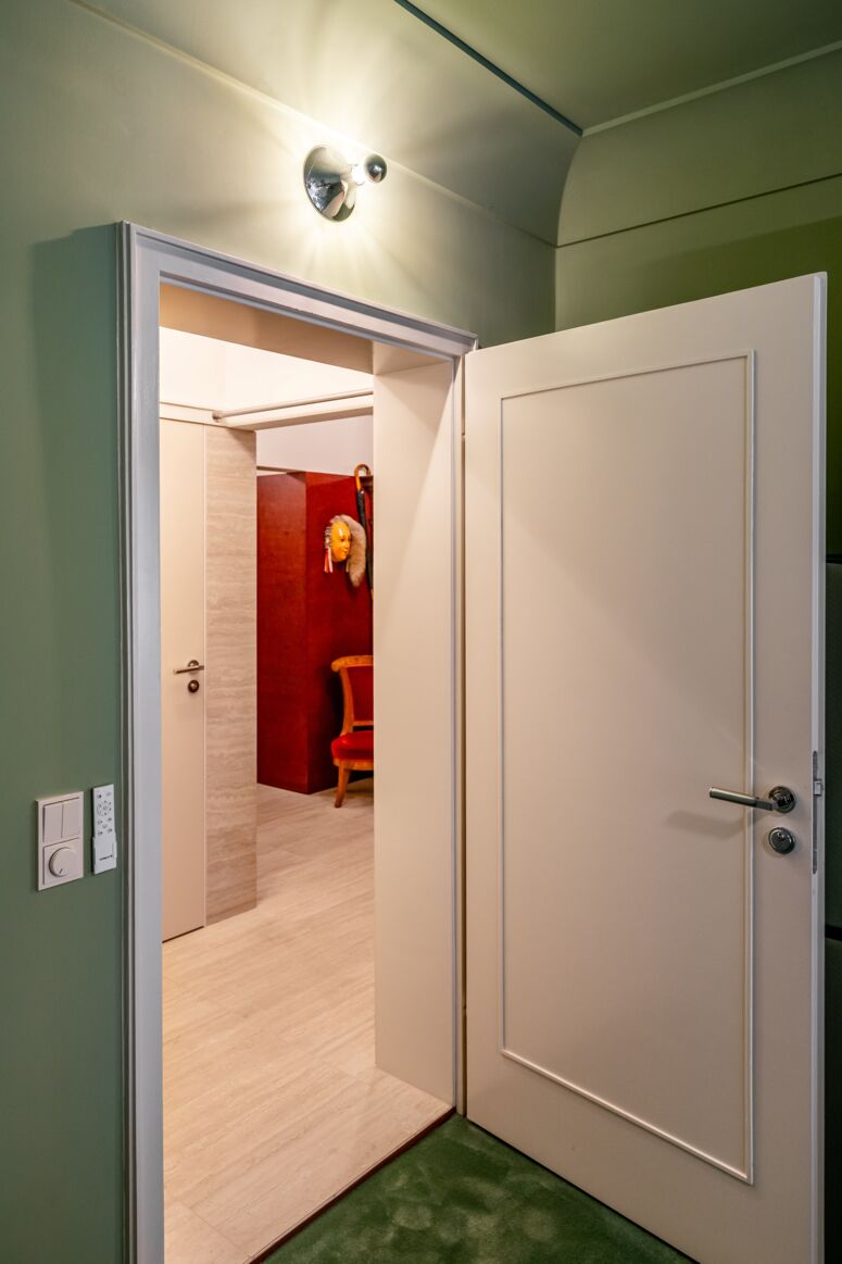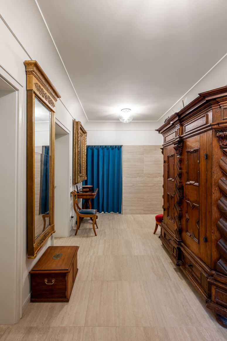 Durch feine Zierleisten auf den Türblättern, Ziernuten in den Sockelleisten, die Hohlkehlen, Mahagoni-Holzvertäfelung und Travertinplatten an Böden und Wänden, entstand zusammen mit der teils antiken Möblierung, ein aufwändiger Innenausbau, der zwischen Historismus und Moderne changiert und viele Besucher an den Geschosswohnungsbau in der Innenstadt von Mailand erinnert.
