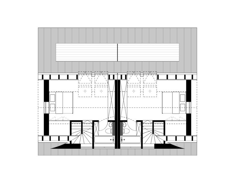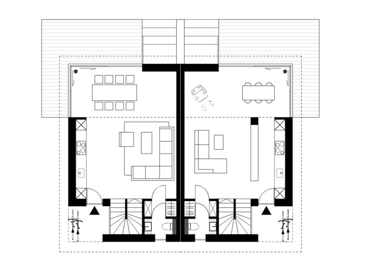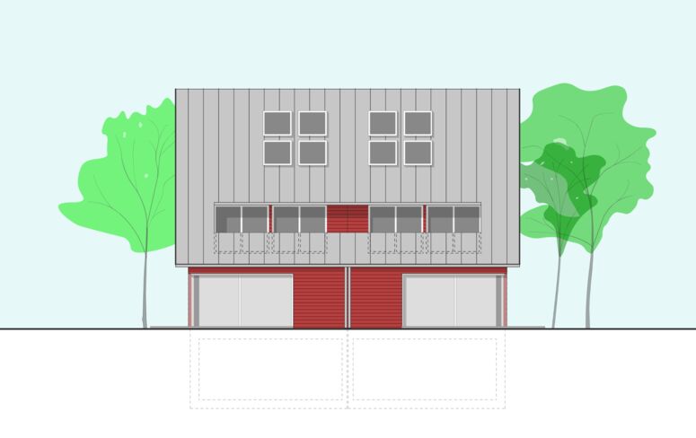 In München-Moosach entstehen in Holzbauweise zwei neue Doppelhäuser für Familien. Atmosphärisches und städtebauliches Vorbild für den Entwurf war ein schwedisches Gehöft: Zusammen mit dem Carport bilden die beiden Doppelhäuser eine Art Platz oder Hof. Die Erschließungsfläche ist so keine karge Asphaltwüste sondern wie der Garten auch ein lebenswerter Außenraum.