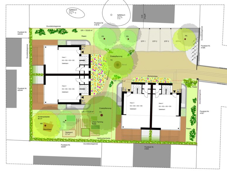 Der Entwurf ermöglicht verschiedene Lebenssituationen und zugleich ein sowohl eigenständiges introvertiertes Wohnen, als auch ein gemeinsames extrovertiertes Erleben des ländlichen Ortes: Der Garten wird wie eine gemeinsam genutzte Streuobstwiese funktionieren, die Kinder der Häuser können hier gemeinsam aufwachsen, barfuß toben und Natur hautnah erleben.
